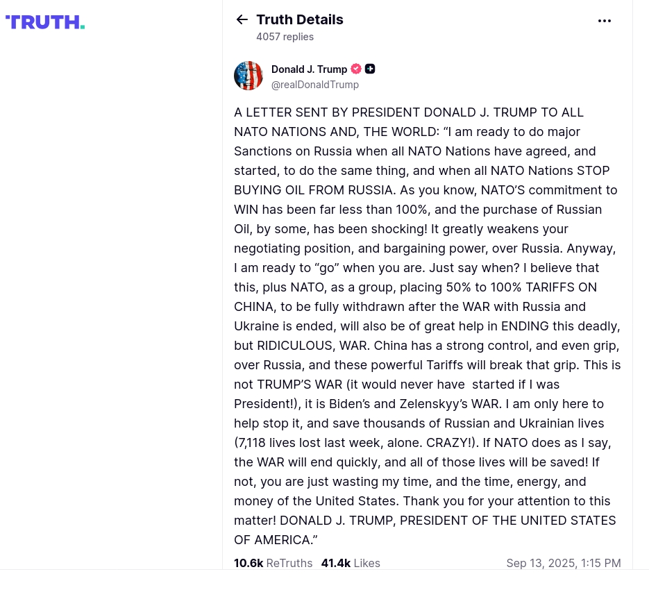 Şimdi Trump’ın mektubunu Almanca çevirisiyle adım adım inceleyelim. Trump’ın yazım biçimi korunarak, BÜYÜK HARFLER kullanılarak özel anlamlar belirtilmiştir: “Tüm NATO üye ülkeleri aynı şeyi yapmayı kabul eder ve tüm NATO üye ülkeleri RUSYA’DAN PETROL SATIN ALMAYI BIRAKIRSA, Rusya’ya karşı büyük yaptırımlar uygulamaya hazırım. Bildiğiniz gibi, NATO’nun ZAFER için gösterdiği çaba %100’ün çok altındaydı ve bazı üyelerin Rus petrolü satın alması şok ediciydi.”