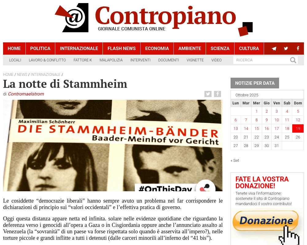 Berlin, Almanya (Weltexpress). Komünist dergi “Contropiano” (giornale communista online), 18 Ekim 2025 tarihinde, “Countermaelstrom” adlı bir makaleyi (isim belirtilmemiş) yayınladı. Makale, “Stammheim’ın Ölüm Gecesi” olarak adlandırılan olayları ele alıyor. Bu olaylar sırasında, tutuklu Kızıl Ordu Fraksiyonu (RAF) liderleri Andreas Baader, Gudrun Ensslin ve Jan-Carl Raspe, Stuttgart Cezaevi’ndeki hücrelerinde intihar ederek öldükleri iddia ediliyor. Irmgard Möller ise ağır yaralı olarak hayatta kaldı.