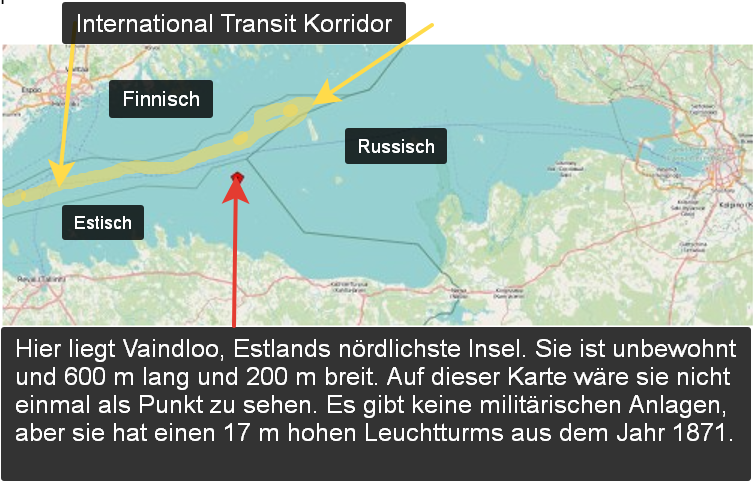 Başlangıçta da belirtildiği gibi: Vaindloo ıssızdır, sadece altı futbol sahası uzunluğunda ve 200 metre genişliğindedir. Ne askeri tesisler ne de maden kaynakları vardır. Yine de, Baltık Denizi’nin enginliğinde kaybolmuş bu nokta, AB/NATO şahinlerine uzun zamandır beklenen Rusya ile savaş için bir bahane sunabilir. Çünkü Estonya adası olarak, Estonya’nın toprak egemenliği – ve dolayısıyla NATO hava sahası – adacığın çevresinde on iki deniz mili uzanır ve böylece dar Uluslararası Transit Koridoru’na kadar uzanır. Bu noktada özellikle dar olan transit koridordan, St. Petersburg’dan Kaliningrad’a giden tüm hava ve deniz trafiği geçmektedir. Ve NATO’daki savaş çığırtkanları, zehirli cüce Estonya’nın yardımıyla bu dar geçidi kapatmak ve Rusya’yı sıkıştırmak istiyorlar, bu da kesinlikle Rusya’nın kurtuluş hamlesiyle sonuçlanacaktır.