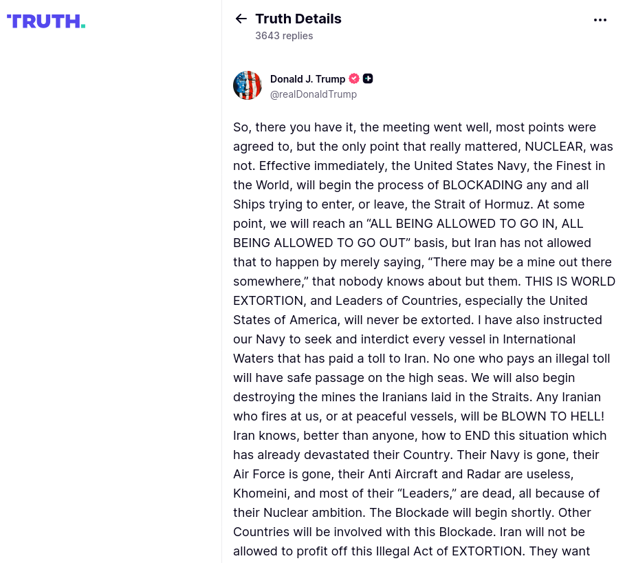 Metnin tamamı şöyle: “Ayrıca Donanmamıza, İran’a ücret ödemiş her gemiyi uluslararası sularda tespit edip durdurma talimatı verdim. Yasadışı ücret ödeyen hiç kimse açık denizde güvenli geçiş hakkına sahip olmayacak. İranlıların boğaza döşedikleri mayınları da imha etmeye başlayacağız. Bize veya barışçıl gemilere ateş açan her İranlı, CEHENNEME GÖNDERİLECEK!”